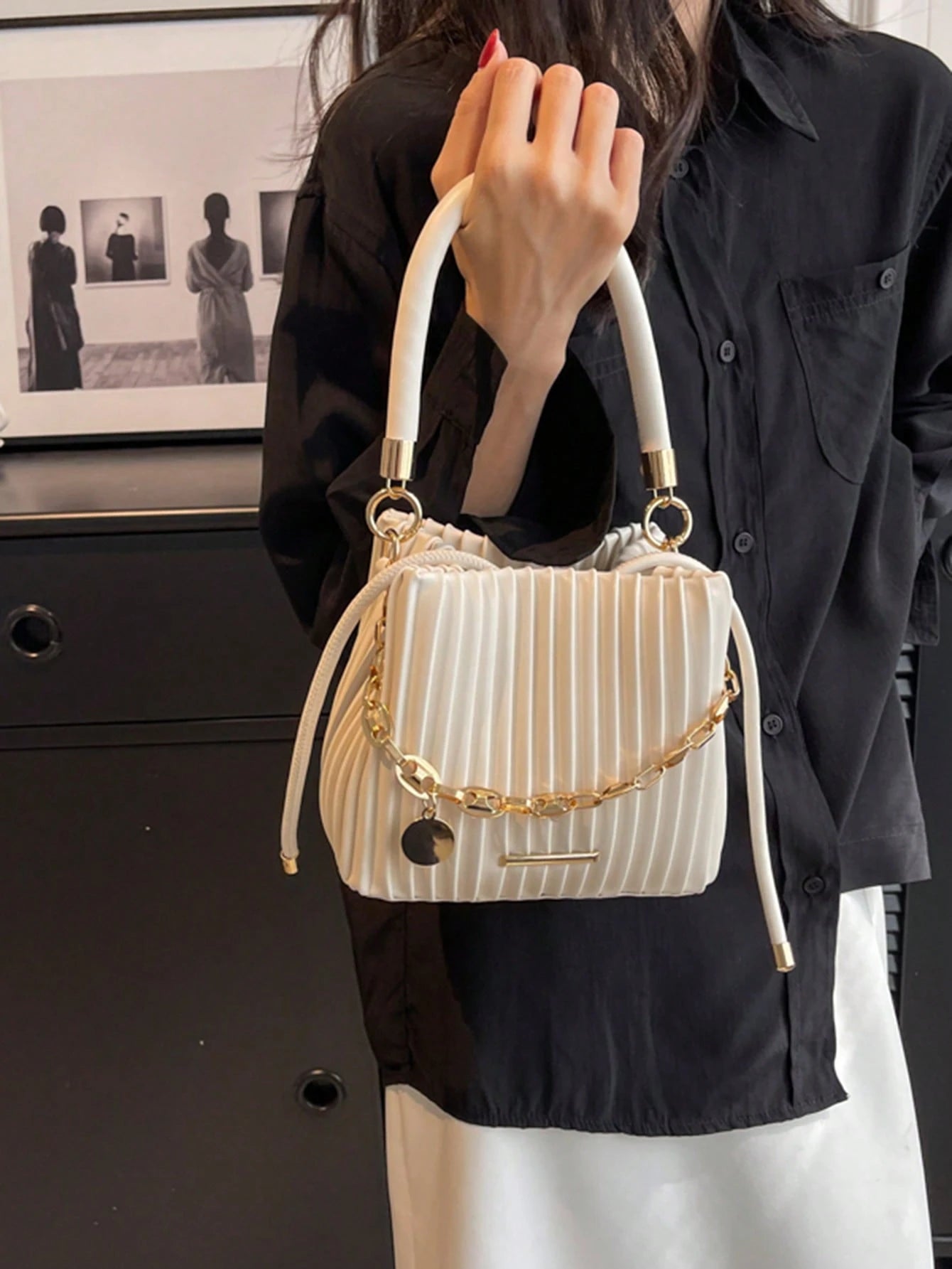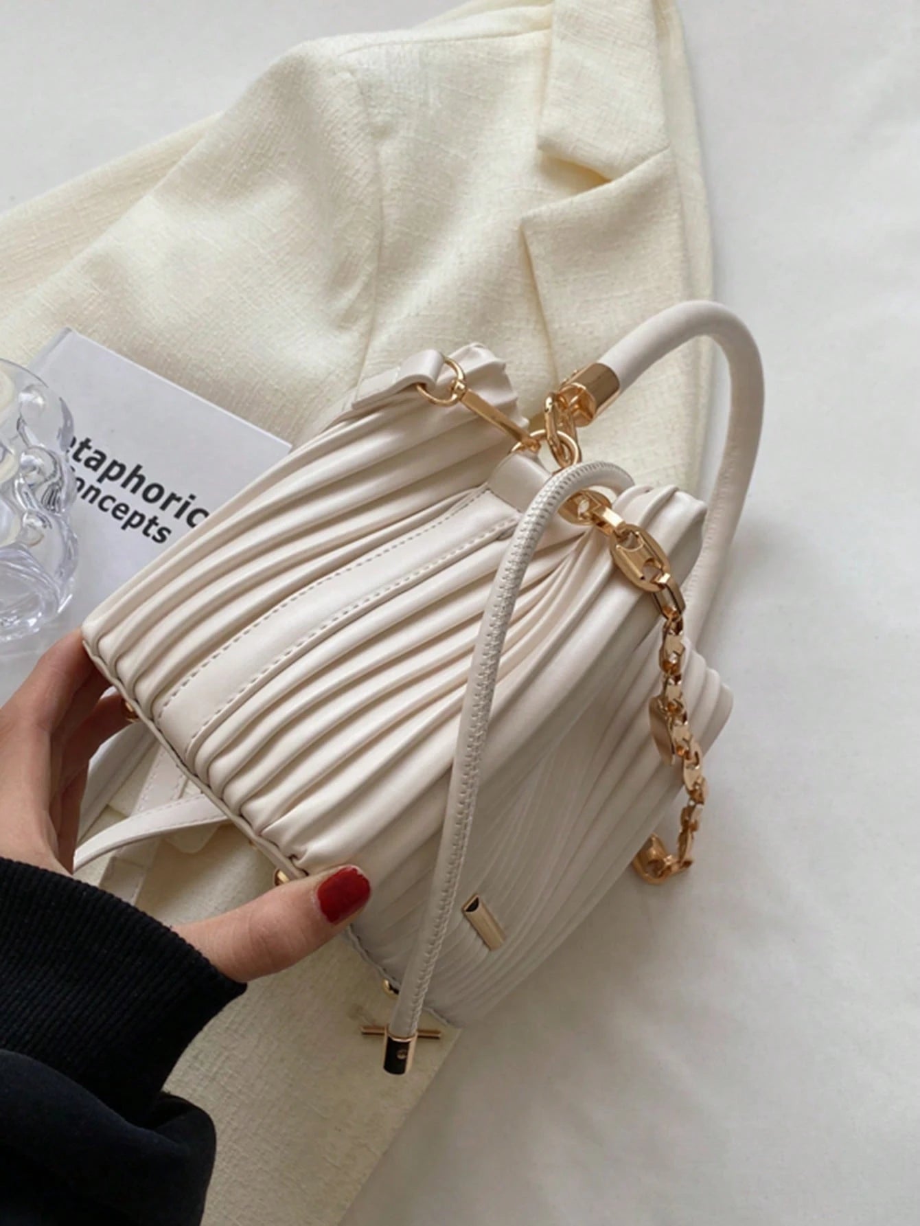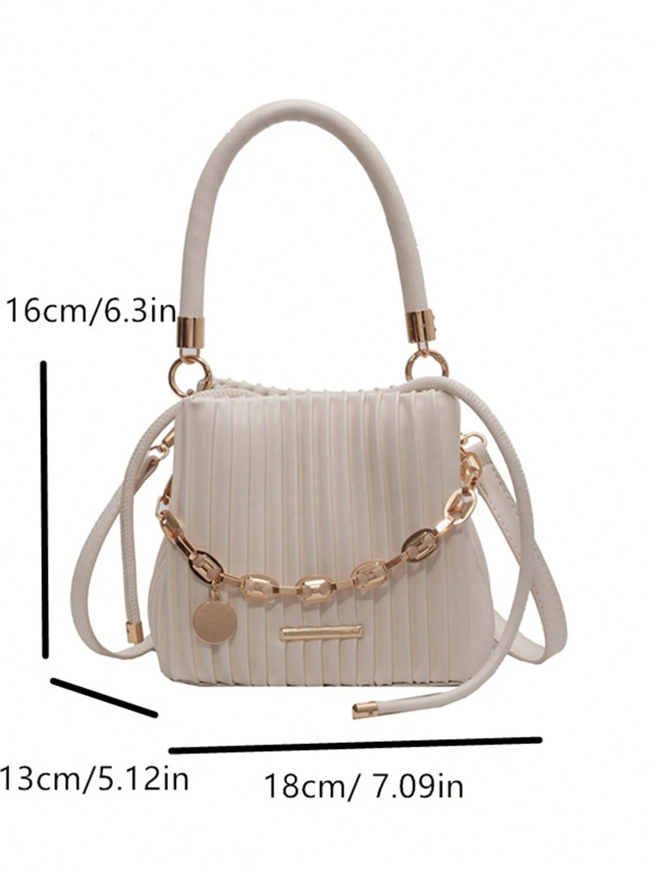 This chic mini bucket bag is the perfect accessory for adding a touch of elegance to any outfit. The unique pleated design creates a stylish texture that stands out, while the metal chain detail on the drawstring closure adds a fashionable and secure element. Its compact size makes it ideal for carrying essentials without being bulky. The bag is made from pleated PU leather and comes with a detachable strap, allowing you to wear it as a shoulder bag or a crossbody bag.