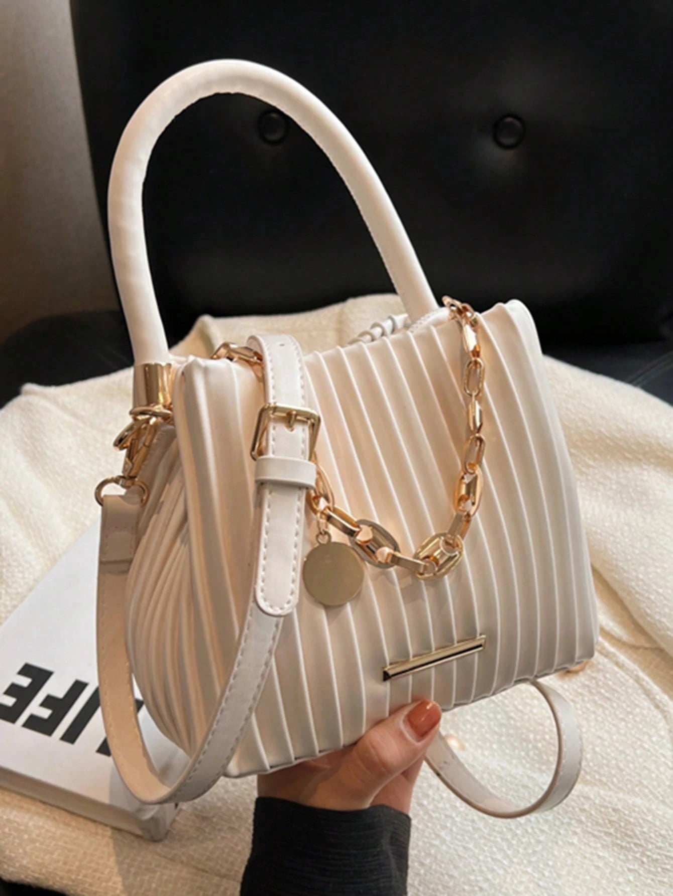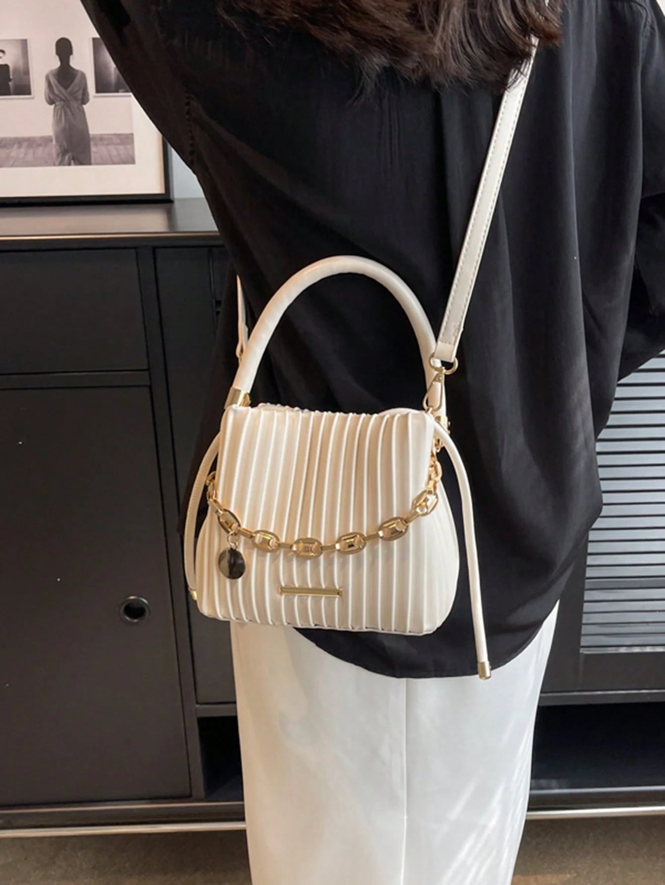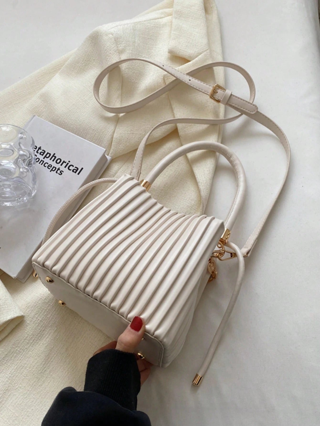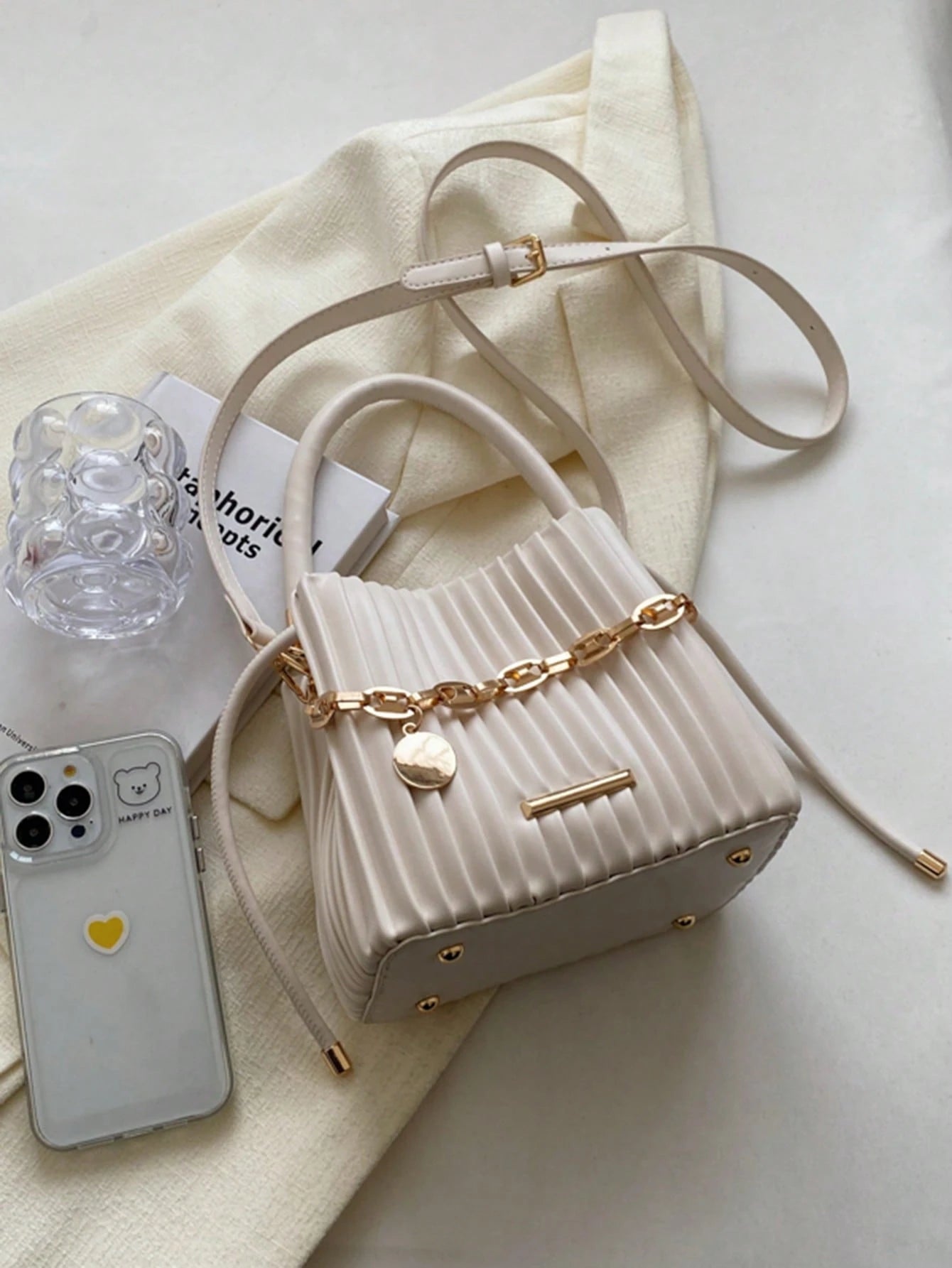 This chic mini bucket bag is the perfect accessory for adding a touch of elegance to any outfit. The unique pleated design creates a stylish texture that stands out, while the metal chain detail on the drawstring closure adds a fashionable and secure element. Its compact size makes it ideal for carrying essentials without being bulky. The bag is made from pleated PU leather and comes with a detachable strap, allowing you to wear it as a shoulder bag or a crossbody bag.